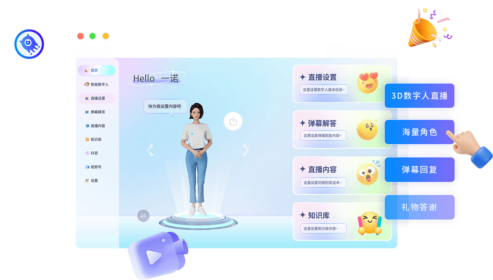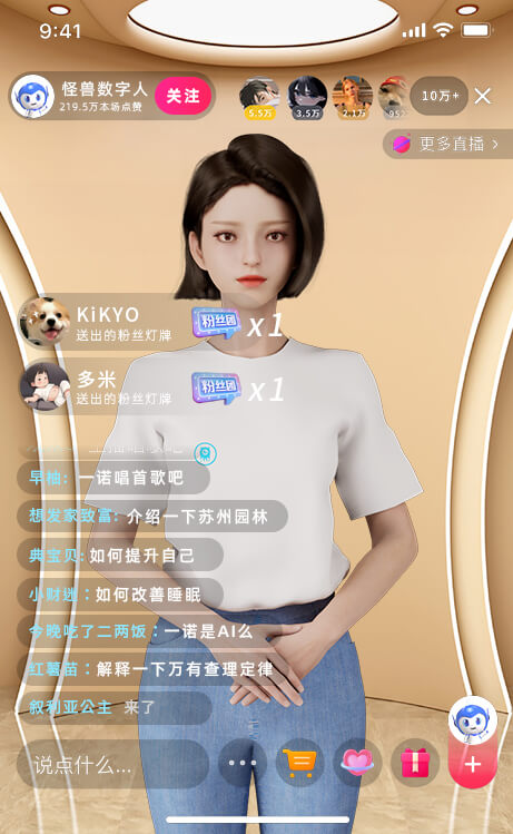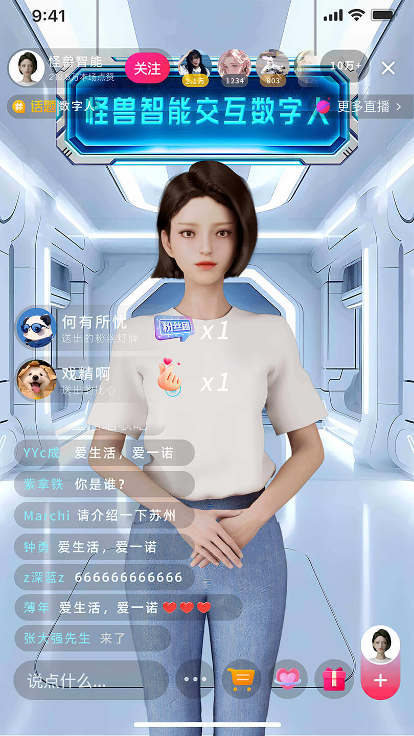 怪兽AI数字人推出的[虚拟化身]是3D数字人应用工具,支持真人动捕驱动+智能脚本驱动的 方式,采用自研的视觉捕捉技术实时驱动数字人直播,同时支持AI智能问答、 姿态交互、动作交互等有趣玩法。